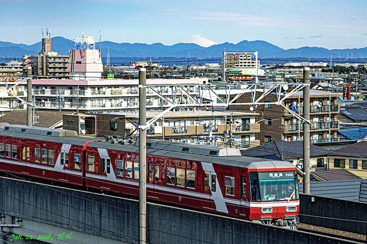 ヤマハ本社ビルから見る新浜松行きの赤い電車と白い富士山1