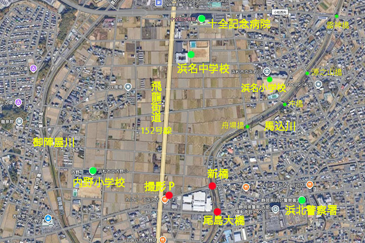 新橋から 250m ほど西の152号線そばの地点P に来ました。