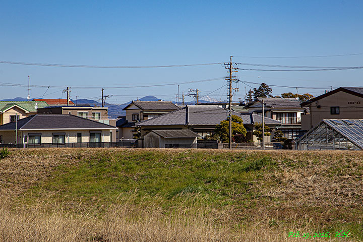 2026年2月3日、瓜内町の中部浄化センター空地の切株の上から「下村橋」越えに見た富士山2