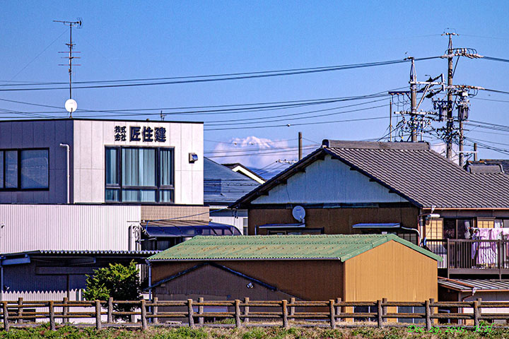 舟場橋を少し北に進み、浜名小校舎と住宅の間に富士が見えます。