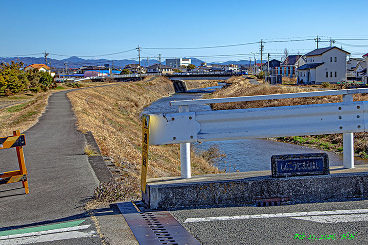 雷神橋の西側から橋の名称と北北東の景色を見ることができます。