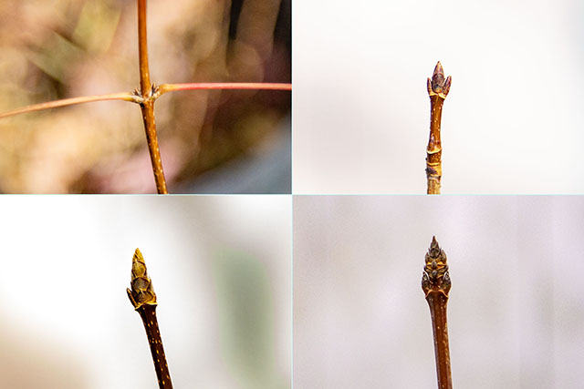 左下;イタリアンメイプルの 11mm ほどの芽、右下;サトウかえでの 12mm ほどの芽