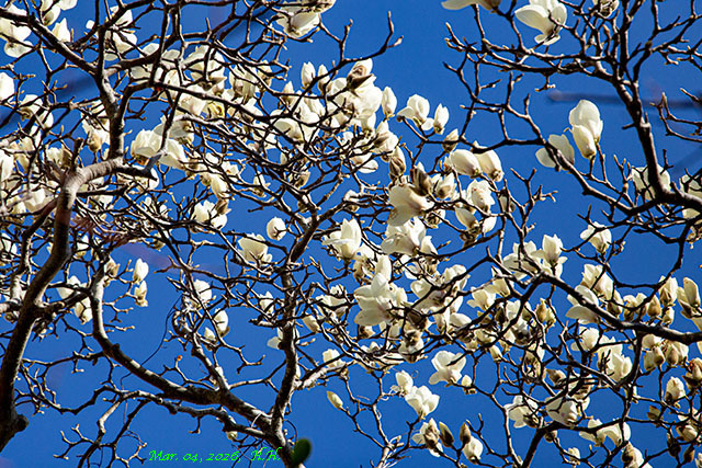 2026年の3月4日、昨日来の雨の後、青空を背景に自宅の木蓮が一気に咲き出しました。