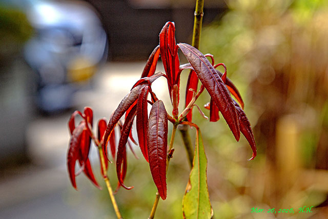 中国産の常緑と思える厚手の単葉で春の出葉時に赤い葉を見せるタイプ2