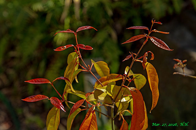 中国産の常緑と思える厚手の単葉で春の出葉時に赤い葉を見せるタイプ1