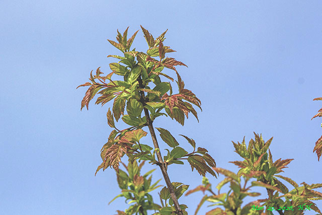 屋根の高さを超えた日本産のカラコギカエデの若葉です。