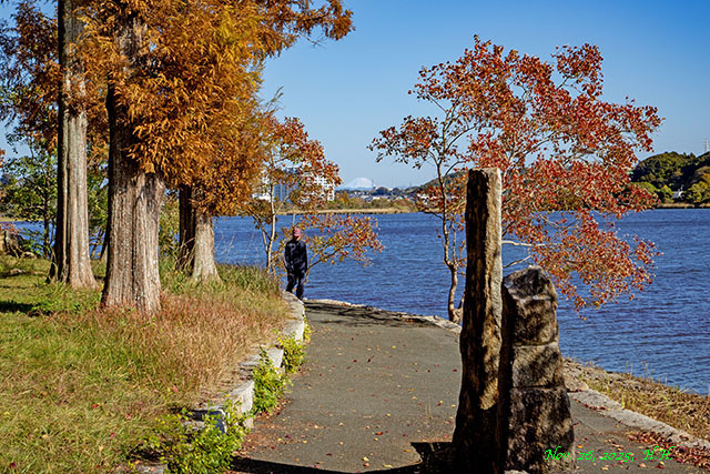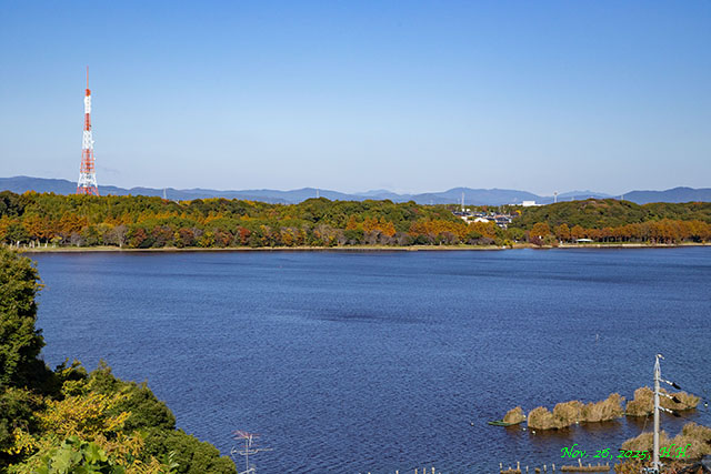 時計台のある公園北側の湖岸沿いの小径から遠くに富士山が見えました。