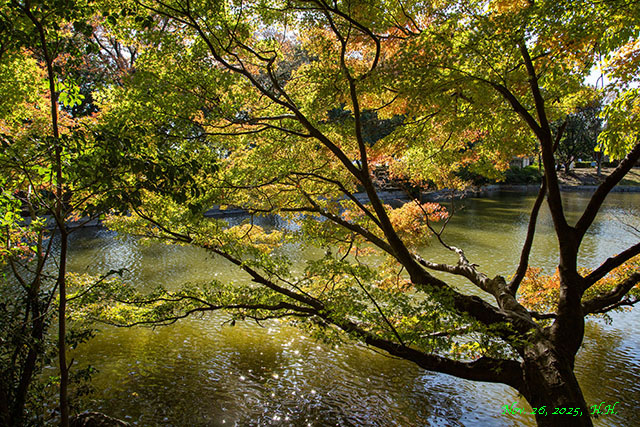 逆光で眺めるひょうたん池の1本のかえでの風景