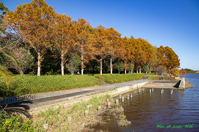 西岸のメタセコイアの風景と時計台の公園の風景を紹介します。