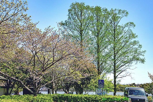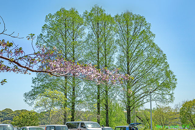 4月11日、公園駐車場の桜の花枝と新緑のメタセコイアの風景2