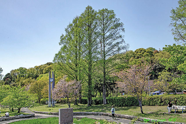 4月11日、東屋から眺めた時計台と桜とメタセコイアの風景