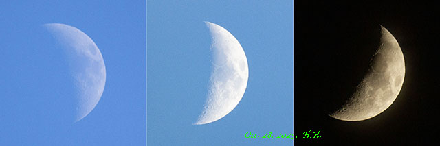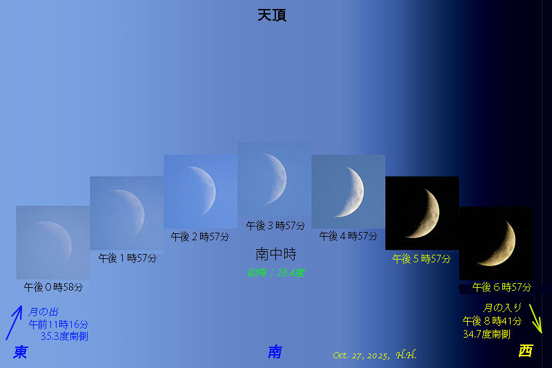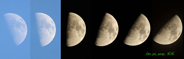 上弦の月(九日月)の南中時前後のほぼ1時間ごとの表情変化です。