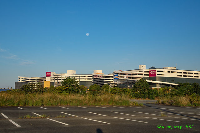 10日午前10時頃の家の前の風景です。田椎橋らのすぐ上にお月さまが見えます。