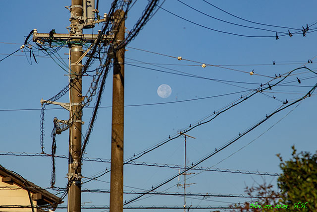 7日午前7時05分頃の自宅前の電線の中の有明の月