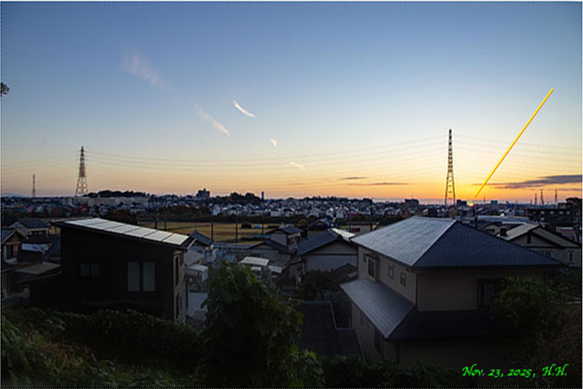 沈む方角が昨日より 2.1度北側(右側)に移動しました。