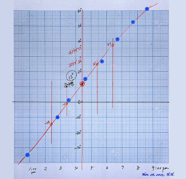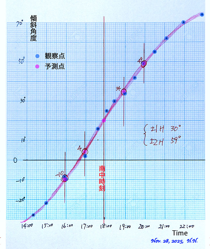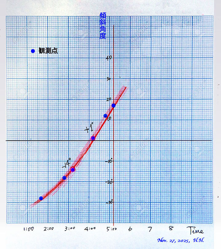 横軸;時刻、縦軸;弦相当の傾斜角度です。